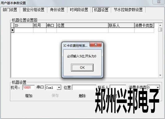 在軟件上添加水控機(jī),售飯機(jī)相應(yīng)的機(jī)器號(hào):打開(kāi)軟件,系統(tǒng)管理---用戶參數(shù)設(shè)置---用戶基本參數(shù)設(shè)置---機(jī)器設(shè)置,在機(jī)號(hào)那添加相應(yīng)的機(jī)器號(hào),例如10001就是1號(hào)機(jī),串口選擇電腦所用的通訊串口。如下圖所示,圖中所用的通訊串口為COM1。但在極其特殊的情況下,會(huì)出現(xiàn)錯(cuò)誤提示,機(jī)器號(hào)開(kāi)頭為0。如圖所示。