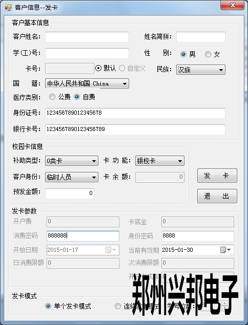 單個(gè)發(fā)卡是現(xiàn)將基本信息填寫(xiě)完成后將卡片放在讀卡器上直接進(jìn)行發(fā)卡。有單個(gè)發(fā)卡模式和連續(xù)發(fā)卡模式兩種發(fā)卡模式。